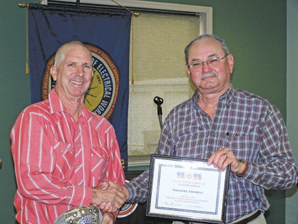 ![]() Local 222 Bus. Mgr. Mike Bell (right) presents service award to Bill Friedman for 40 years of loyal IBEW membership. |