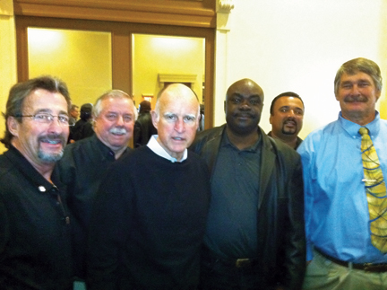 ![]() California Gov. Jerry Brown (third from left) with Local 340 officers at CSAEW meeting. From left: Local 340 Pres. Tom Meredith, Bus. Mgr. A.C. Steelman, Gov. Brown, Bus. Dev. Rep. D'Elman Clark, Examining Board member Jason Prasad and Executive Board member Brian Bailey. |