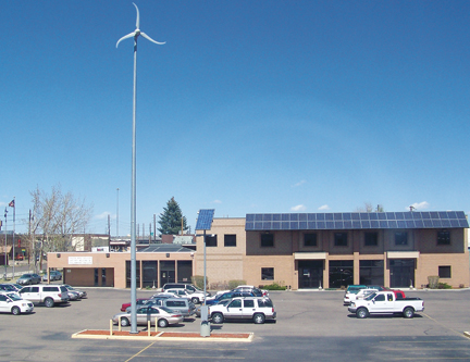![]() Wind turbine and solar panels at Denver Local 68 union hall. |