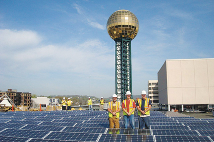 L.U. 760 (i,lctt,o,rts,spa&u), KNOXVILLE,TN — Good relations with city and county officials have Local 760 at work. Local 760 members have been installing solar panels on the Knoxville Convention Center in downtown Knoxville. White Electric, from North Carolina, was awarded the project in the shadows of the 1982 World's Fair Sunsphere. |
