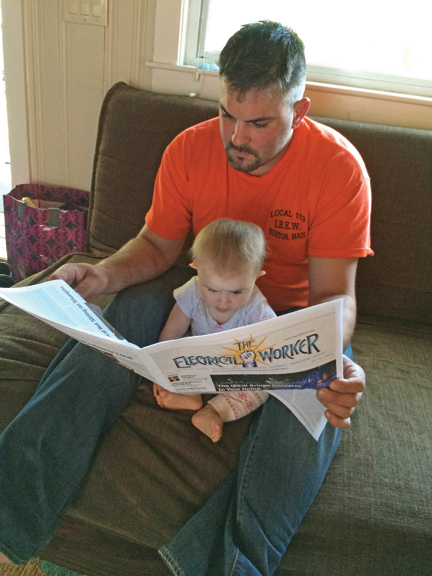 My husband, Local 103 member Mike Fernandes, and 8-month-old daughter, Elizabeth, reading the May 2014 issue of The Electrical Worker. |